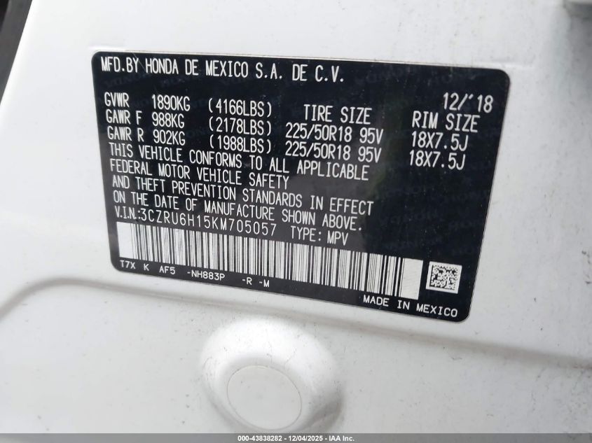 2019 HONDA HR-V 2019 року Бензин, 1.8, Полный привод, vin - 3CZRU6H15KM705057 из США