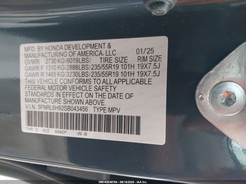 2025 HONDA ODYSSEY 2025 року Бензин, 3.5, Передний привод, vin - 5FNRL6H92SB043456 из США