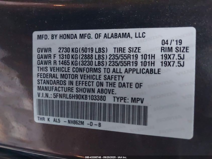 2019 HONDA ODYSSEY 2019 року Бензин, 3.5, Передний привод, vin - 5FNRL6H90KB103380 из США