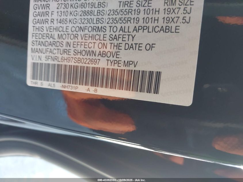 Цвет ЧерныйЦилиндры 6Привод Передний приводVIN 5FNRL6H97SB022697Состояние Заводится и едет (проверено)Повреждения Правая сторона