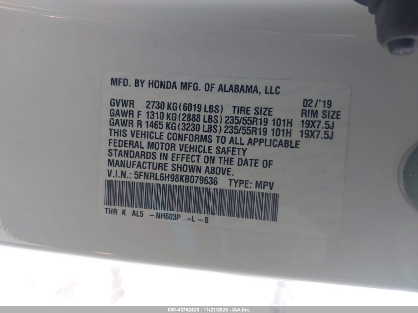 2019 HONDA ODYSSEY 2019 року Бензин, 3.5, Передний привод, vin - 5FNRL6H98KB079636 из США