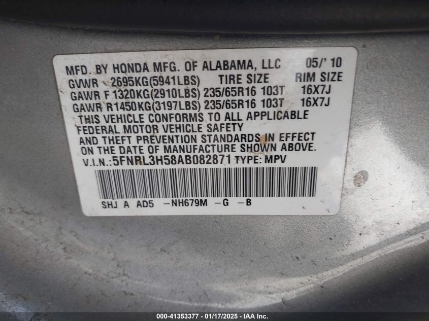 Цвет СинийЦилиндры 6Привод Передний приводVIN 5FNRL3H58AB082871Состояние Заводится и едет (проверено)Повреждения Правая сторона AutoRIA