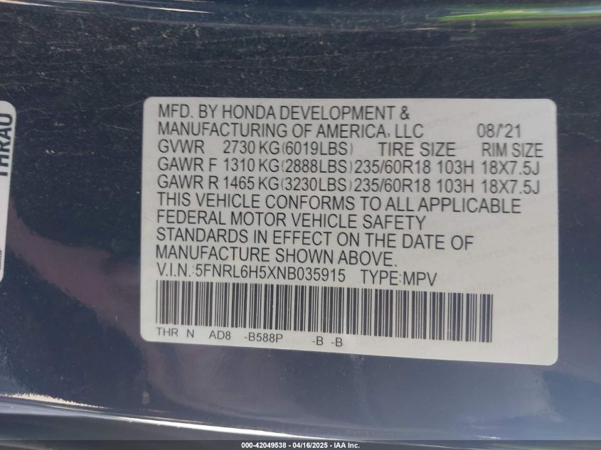 2022 HONDA ODYSSEY 2022 року Бензин, 3.5, Передний привод, vin - 5FNRL6H5XNB035915 из США