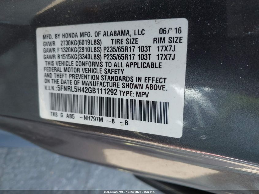Цвет СерыйЦилиндры 6Привод Передний приводVIN 5FNRL5H42GB111292Состояние Заводится и едет (проверено)Повреждения Передняя левая AutoRIA