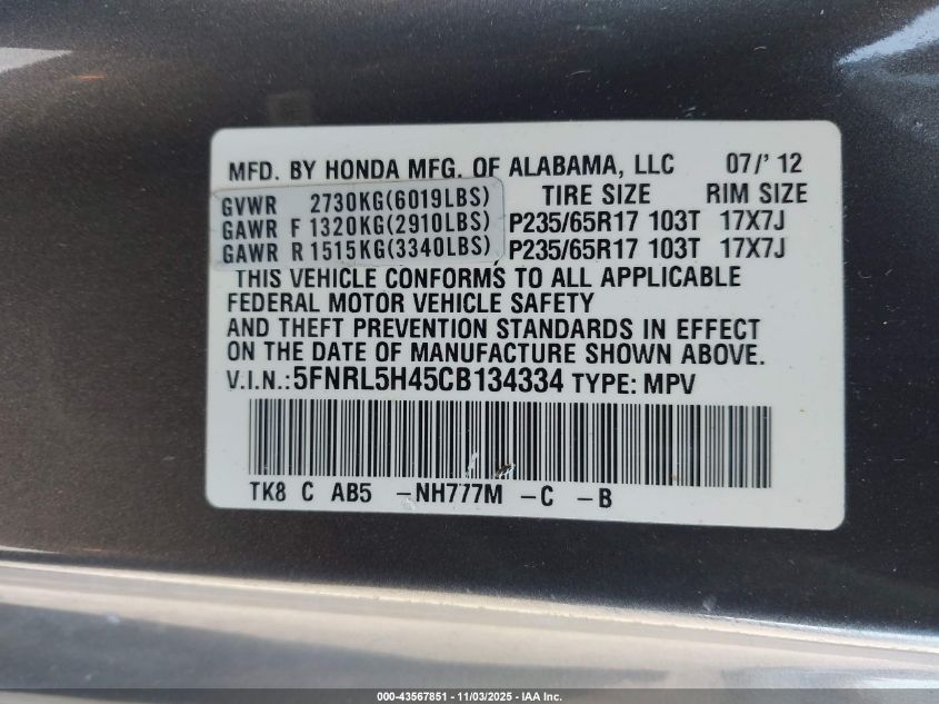 Цвет СерыйЦилиндры 6Привод Передний приводVIN 5FNRL5H45CB134334Состояние СтационарноПовреждения Передняя правая AutoRIA