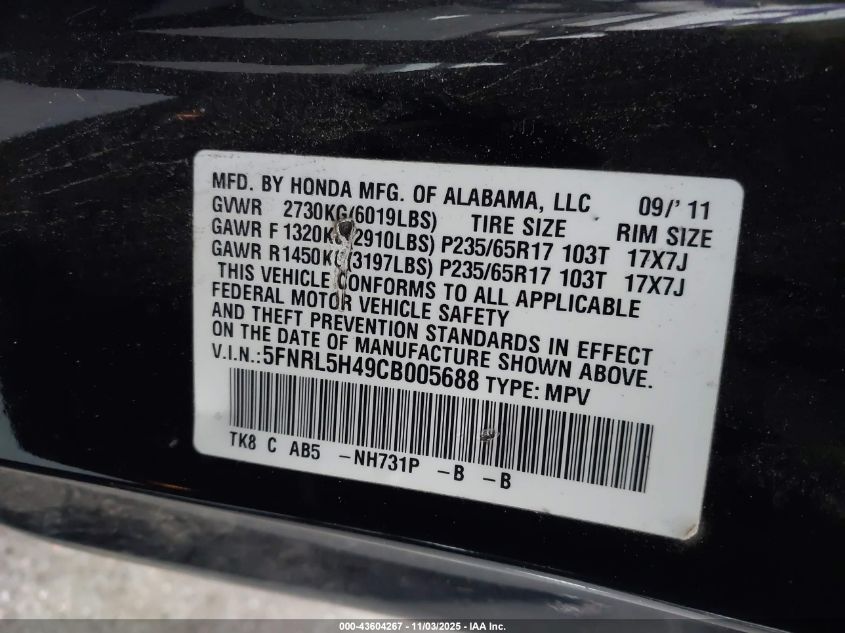 Цвет ЧерныйЦилиндры 6Привод Передний приводVIN 5FNRL5H49CB005688Состояние СтационарноПовреждения Левая сторона AutoRIA