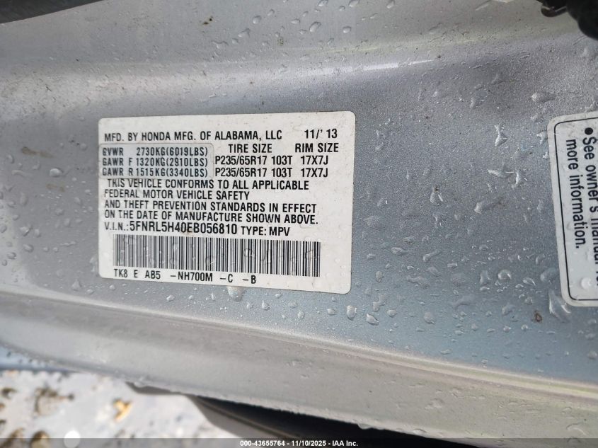 Цвет СеребряныйЦилиндры 6Привод Передний приводVIN 5FNRL5H40EB056810Состояние СтационарноПовреждения Передняя или задняя AutoRIA