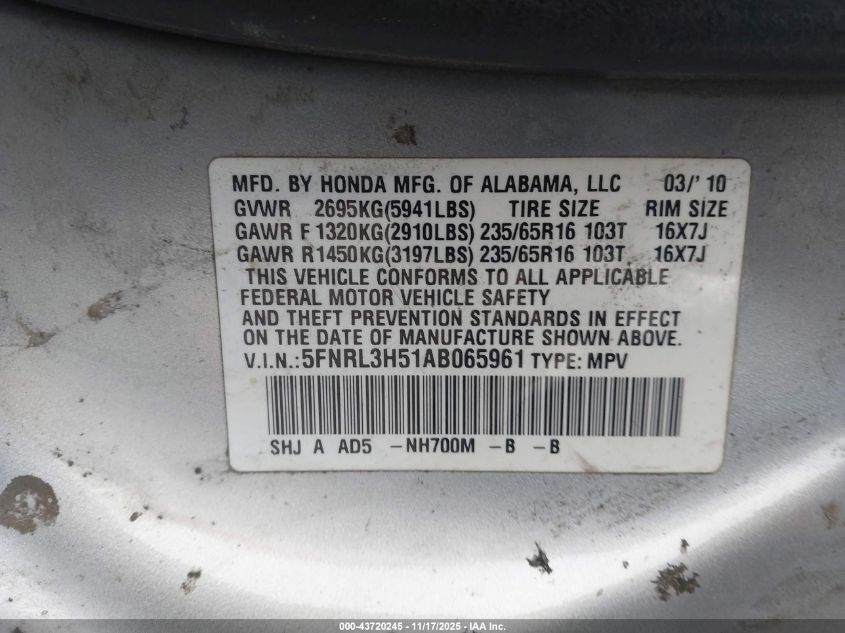 Цвет СеребряныйЦилиндры 6Привод Передний приводVIN 5FNRL3H51AB065961Состояние Заводится и едет (проверено)Повреждения Низ AutoRIA