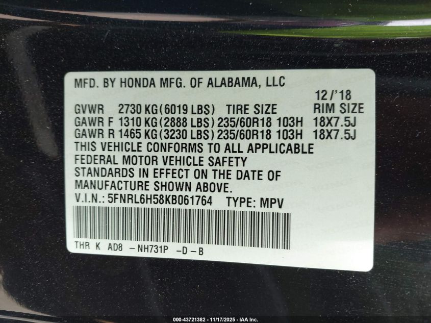 2019 HONDA ODYSSEY 2019 року Бензин, 3.5, Передний привод, vin - 5FNRL6H58KB061764 из США
