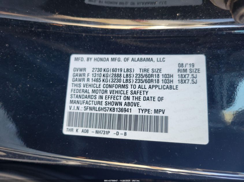 2019 HONDA ODYSSEY 2019 року Бензин, 3.5, Передний привод, vin - 5FNRL6H57KB136941 из США