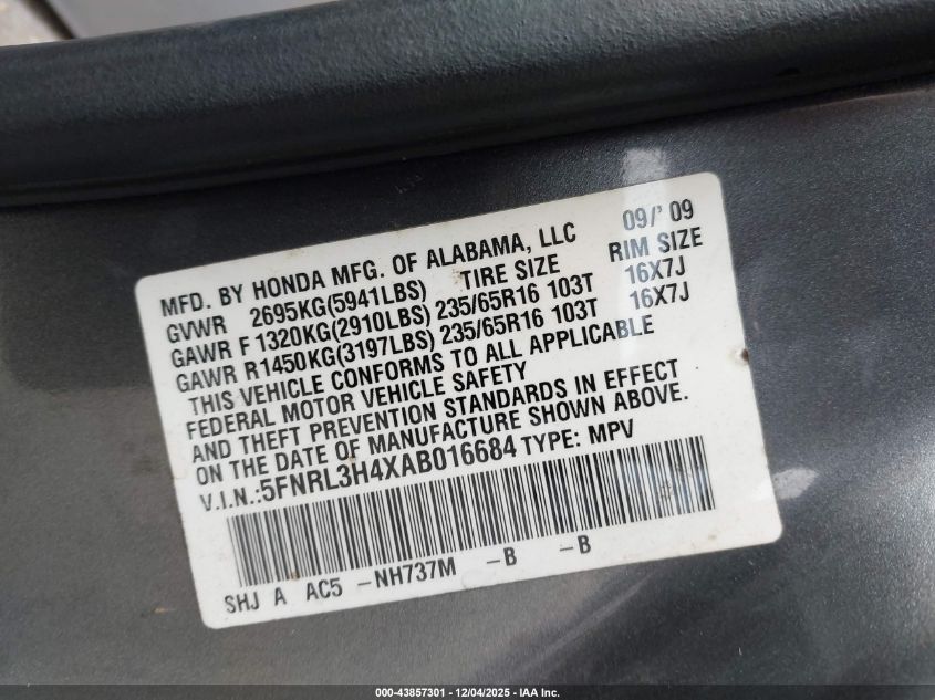 Цвет СерыйЦилиндры 6Привод Передний приводVIN 5FNRL3H4XAB016684Состояние Заводится и едет (проверено)Повреждения По бокам AutoRIA