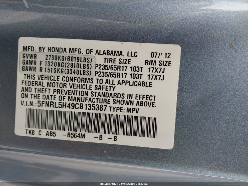 Цвет СинийЦилиндры 6Привод Передний приводVIN 5FNRL5H49CB135387Состояние Заводится и едет (проверено)Повреждения Передняя правая AutoRIA