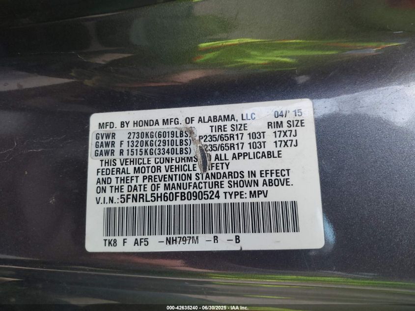 Цвет СерыйЦилиндры 6Привод Передний приводVIN 5FNRL5H60FB090524Состояние СтационарноПовреждения Передняя и задняя AutoRIA