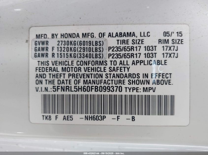 2015 HONDA ODYSSEY 2015 року Бензин, 3.5, Передний привод, vin - 5FNRL5H60FB099370 из США