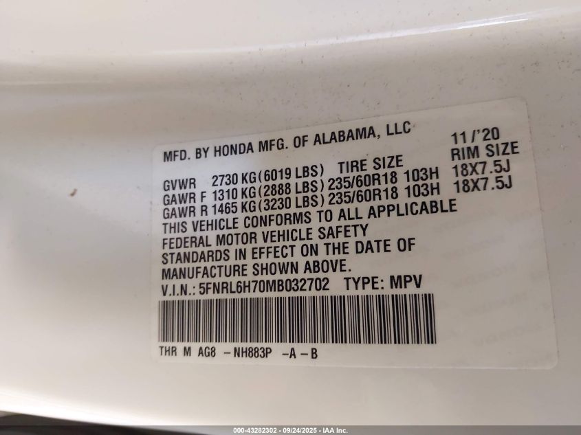 Цвет БелыйЦилиндры 6Привод Передний приводVIN 5FNRL6H70MB032702Состояние СтационарноПовреждения Био/ХимическиеДата аукциона 2025-12-09