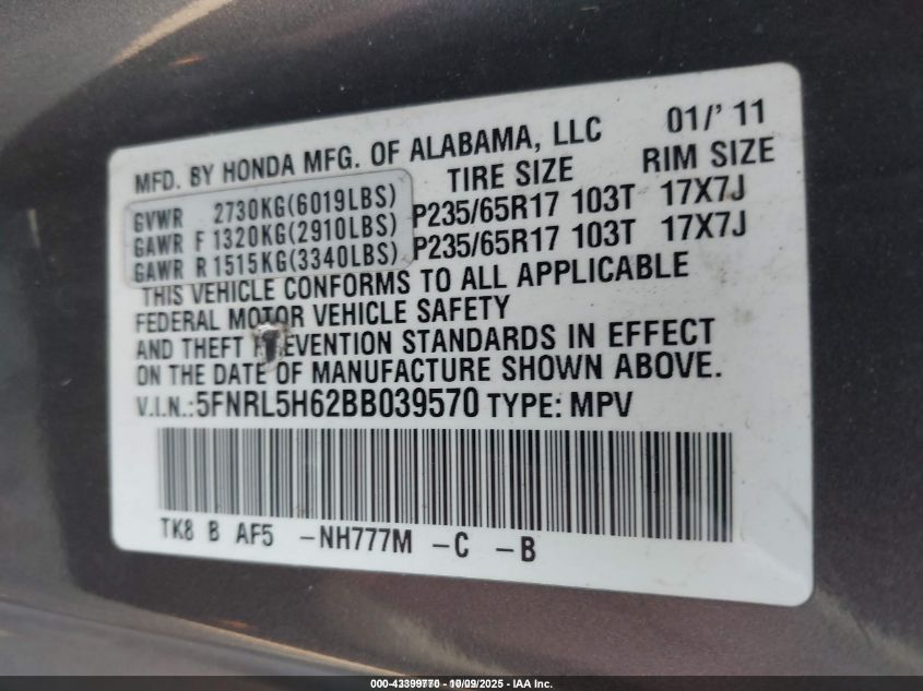 Цвет СерыйЦилиндры 6Привод Передний приводVIN 5FNRL5H62BB039570Состояние СтационарноПовреждения По всему авто AutoRIA