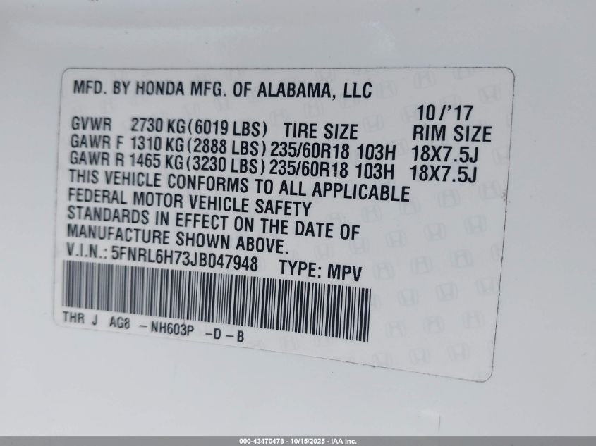 Цвет БелыйЦилиндры 6Привод Передний приводVIN 5FNRL6H73JB047948Состояние ЗаводитсяПовреждения Передняя или задняя AutoRIA