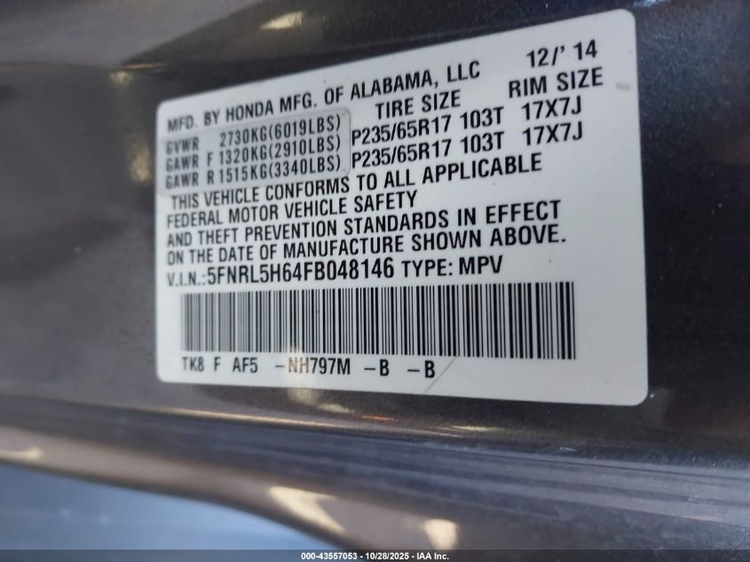 Цвет СерыйЦилиндры 6Привод Передний приводVIN 5FNRL5H64FB048146Состояние Заводится и едет (проверено)Повреждения Правая сторонаДата аукциона 2025-12-11 AutoRIA