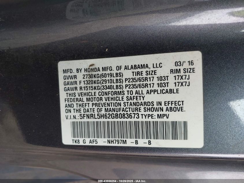 Цвет СерыйЦилиндры 6Привод Передний приводVIN 5FNRL5H62GB083673Состояние СтационарноПовреждения Передняя или задняяДата аукциона 2025-12-12 AutoRIA