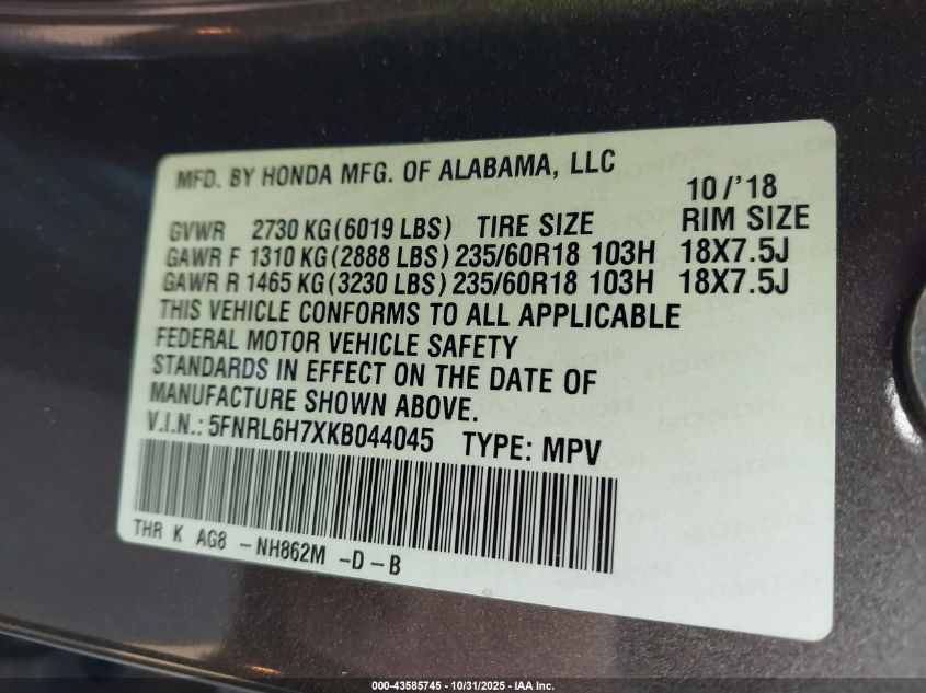 2019 HONDA ODYSSEY TOURING