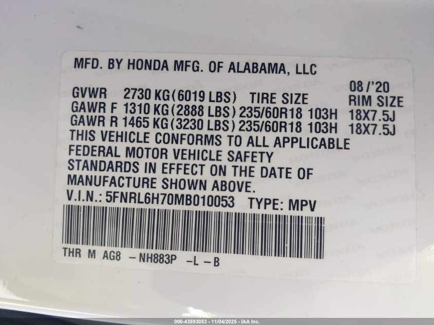 Цвет БелыйЦилиндры 6Привод Передний приводVIN 5FNRL6H70MB010053Состояние СтационарноПовреждения Передняя или задняя