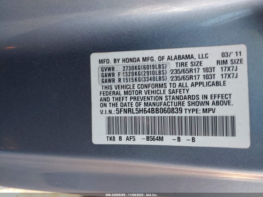 Цвет СинийЦилиндры 6Привод Передний приводVIN 5FNRL5H64BB060839Состояние Заводится и едет (проверено)Повреждения Правая сторона AutoRIA