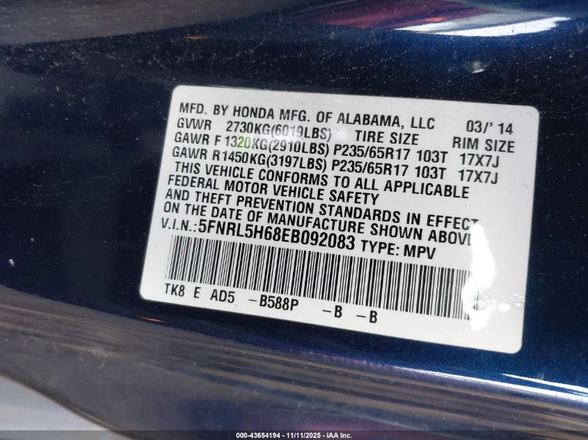 Цвет СинийЦилиндры 6Привод Передний приводVIN 5FNRL5H68EB092083Состояние СтационарноПовреждения Передняя или задняя AutoRIA