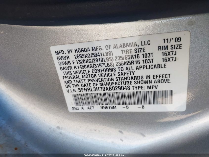 Цвет СеребряныйЦилиндры 6Привод Передний приводVIN 5FNRL3H70AB029048Состояние СтационарноПовреждения Задняя праваяДата аукциона 2025-12-10 AutoRIA