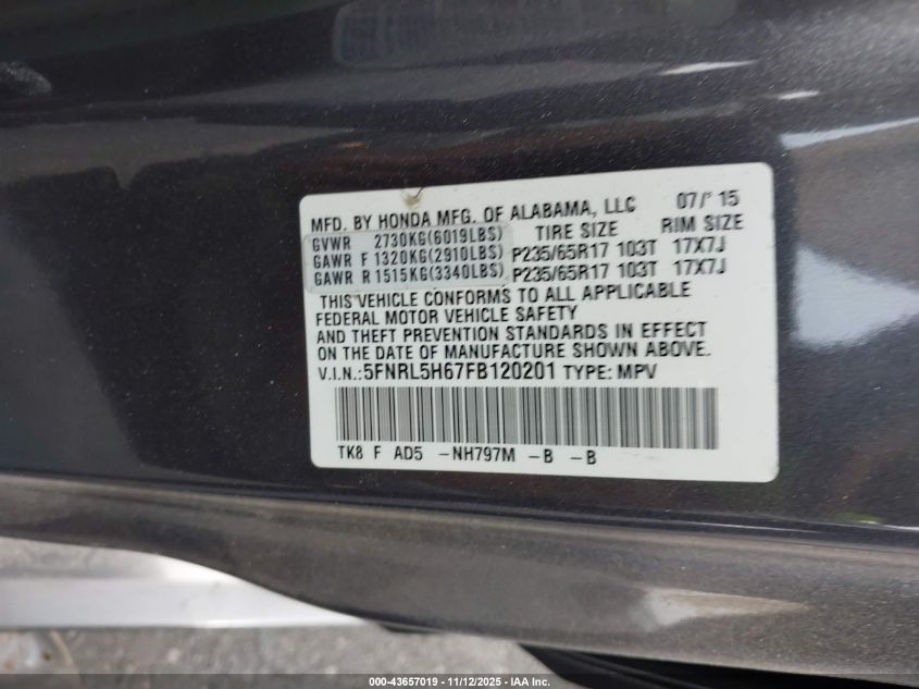 2015 HONDA ODYSSEY 2015 року Бензин, 3.5, Передний привод, vin - 5FNRL5H67FB120201 из США