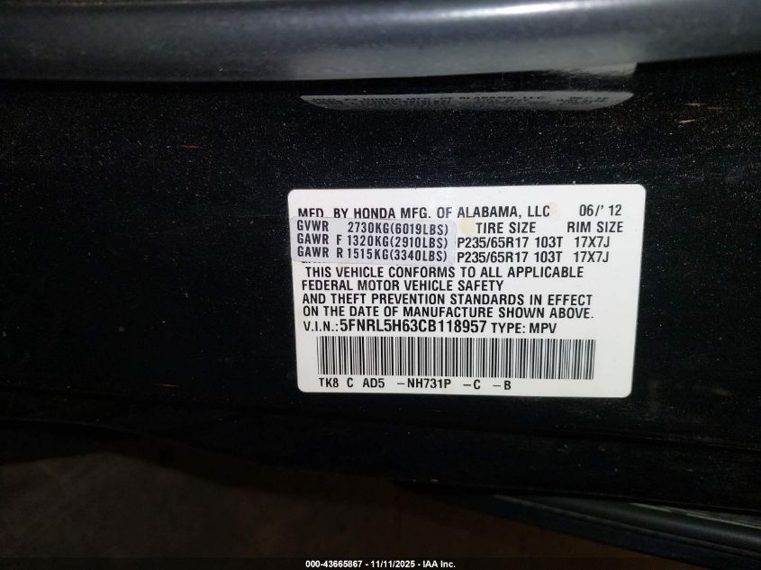 Цвет ЧерныйЦилиндры 6Привод Передний приводVIN 5FNRL5H63CB118957Состояние Заводится и едет (проверено)Повреждения Передняя правая AutoRIA