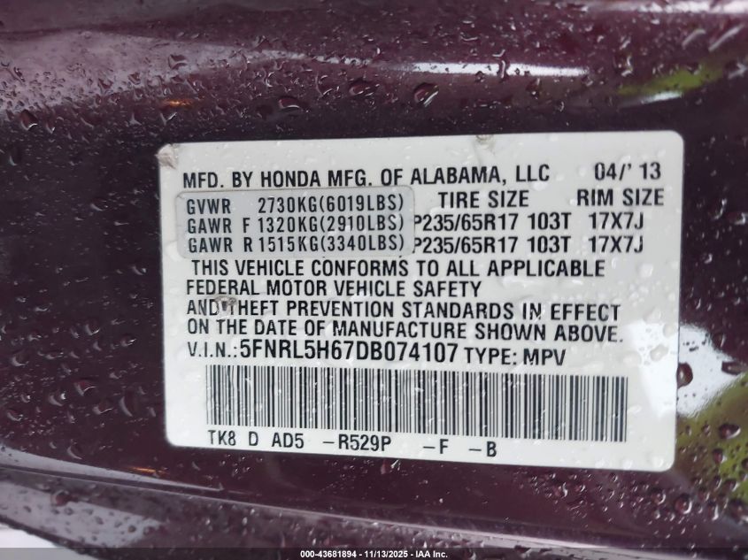 Цвет БургундияЦилиндры 6Привод Передний приводVIN 5FNRL5H67DB074107Состояние СтационарноПовреждения Передняя или задняя AutoRIA