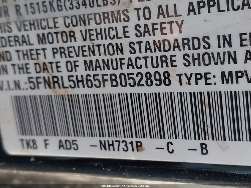 Цвет ЧерныйЦилиндры 6Привод Передний приводVIN 5FNRL5H65FB052898Состояние Заводится и едет (проверено)Повреждения Передняя или задняя AutoRIA