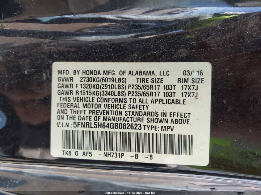 2016 HONDA ODYSSEY 2016 року Бензин, 3.5, Передний привод, vin - 5FNRL5H64GB082623 из США