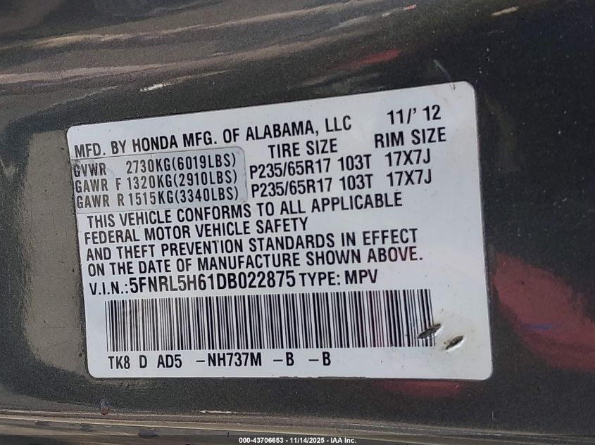 Цвет СерыйЦилиндры 6Привод Передний приводVIN 5FNRL5H61DB022875Состояние Заводится и едет (проверено)Повреждения Передняя или задняя AutoRIA