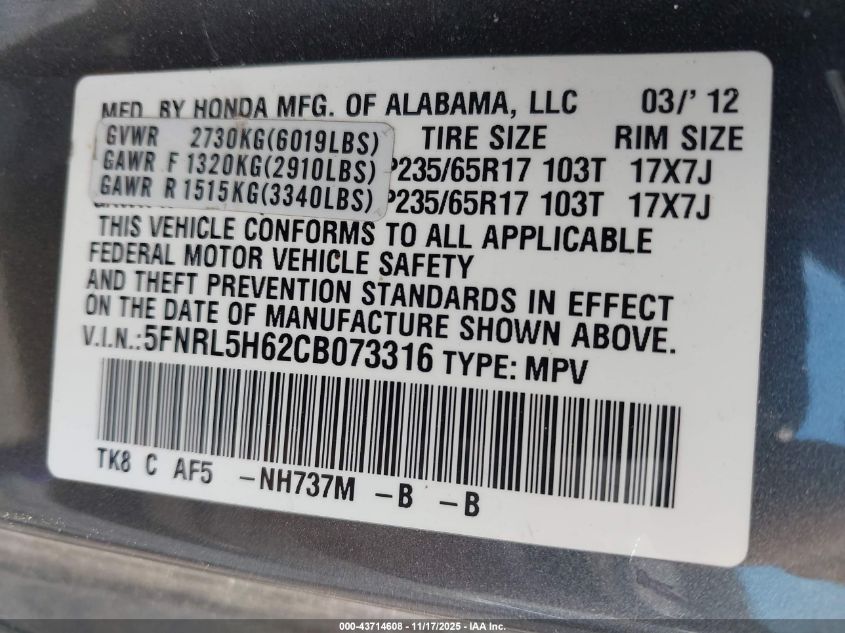Цвет СерыйЦилиндры 6Привод Передний приводVIN 5FNRL5H62CB073316Состояние СтационарноПовреждения Задняя AutoRIA
