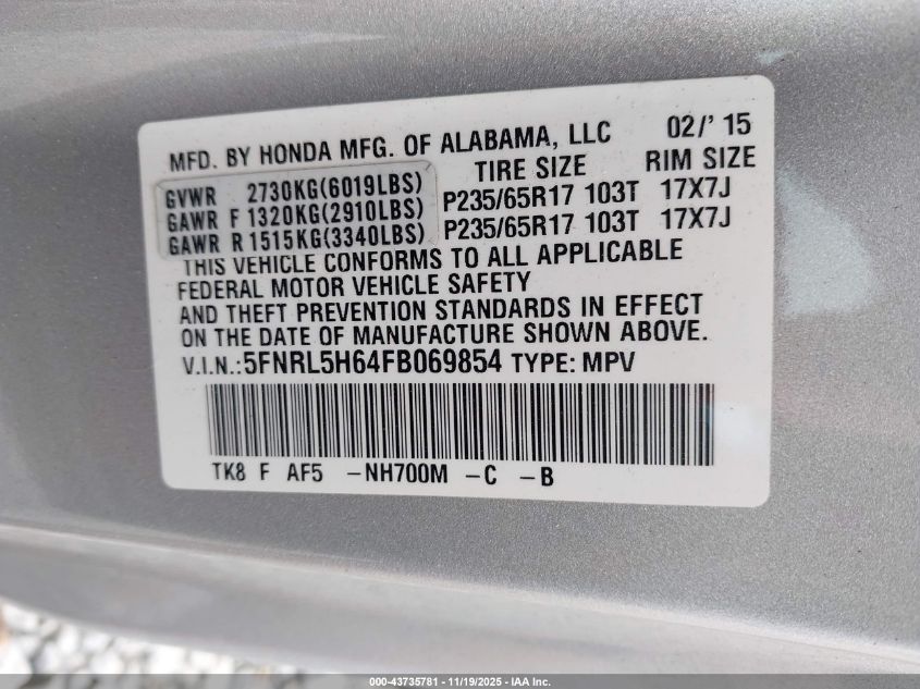 2015 HONDA ODYSSEY 2015 року Бензин, 3.5, Передний привод, vin - 5FNRL5H64FB069854 из США