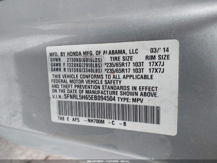 Цвет СеребряныйЦилиндры 6Привод Передний приводVIN 5FNRL5H65EB094504Состояние СтационарноПовреждения По бокам AutoRIA