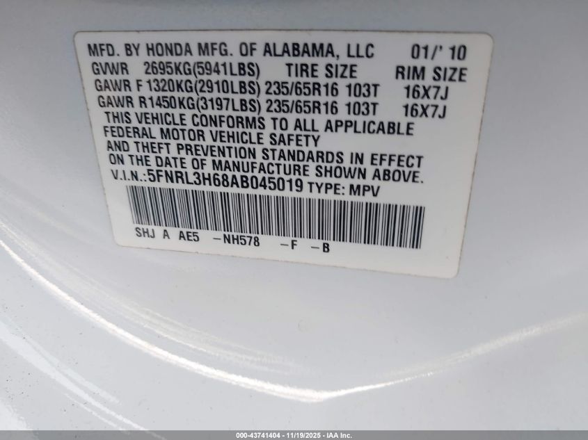 Цвет БелыйЦилиндры 6Привод Передний приводVIN 5FNRL3H68AB045019Состояние Заводится и едет (проверено)Повреждения По бокамДата аукциона 2025-12-16 AutoRIA