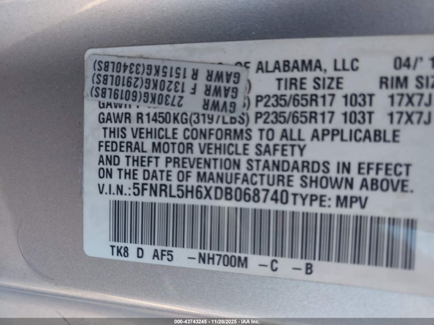 Цвет СеребряныйЦилиндры 6Привод Передний приводVIN 5FNRL5H6XDB068740Состояние Заводится и едет (проверено)Повреждения Задняя AutoRIA