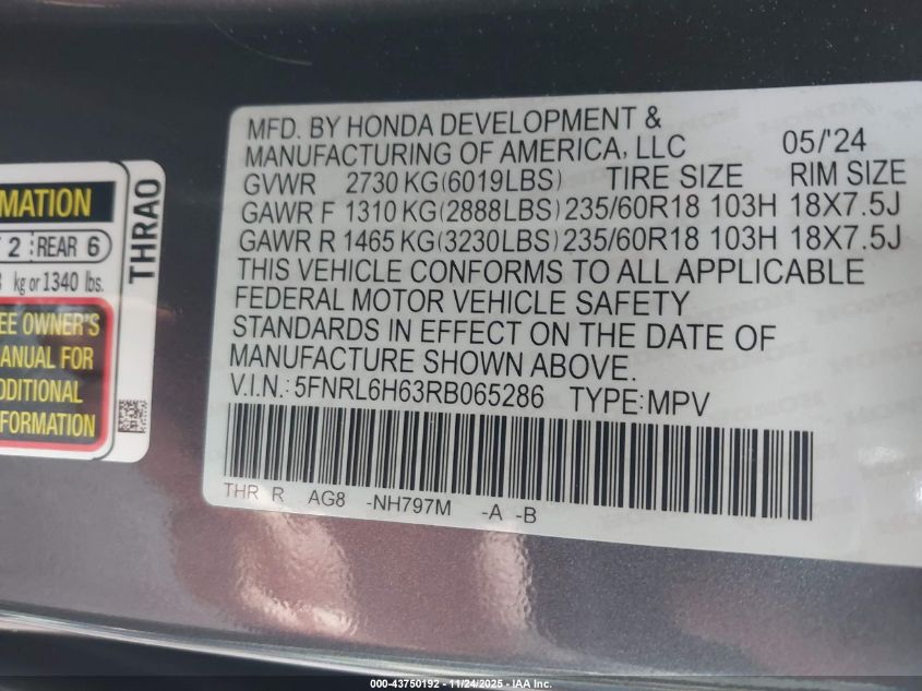 2024 HONDA ODYSSEY 2024 року Бензин, 3.5, Передний привод, vin - 5FNRL6H63RB065286 из США