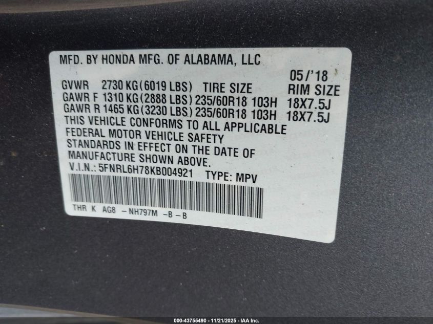 Цвет СерыйЦилиндры 6Привод Передний приводVIN 5FNRL6H78KB004921Состояние СтационарноПовреждения Передняя или задняя AutoRIA