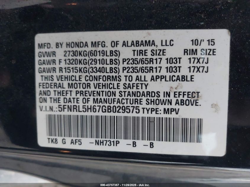 Цвет ЧерныйЦилиндры 6Привод Передний приводVIN 5FNRL5H67GB029575Состояние Заводится и едет (проверено)Повреждения Передняя правая AutoRIA