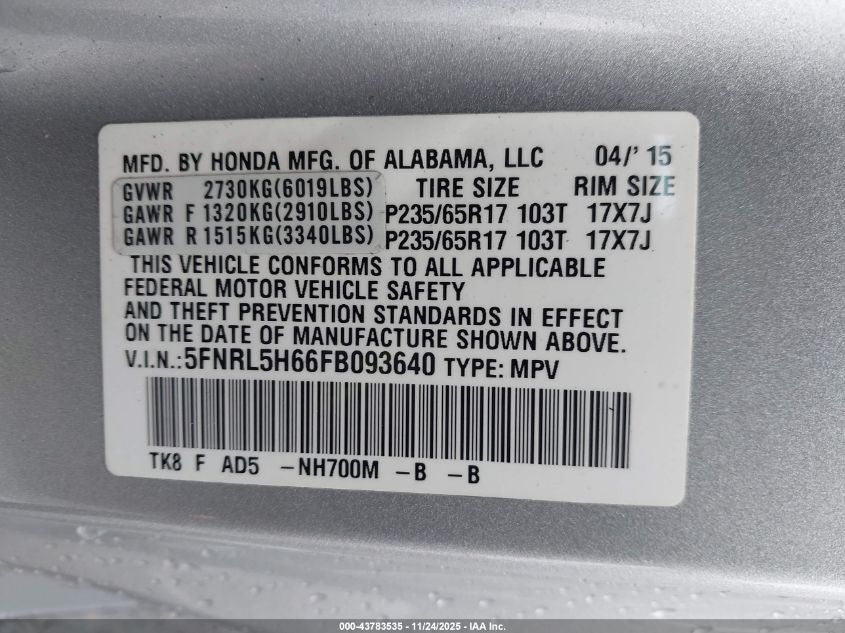2015 HONDA ODYSSEY 2015 року Бензин, 3.5, Передний привод, vin - 5FNRL5H66FB093640 из США