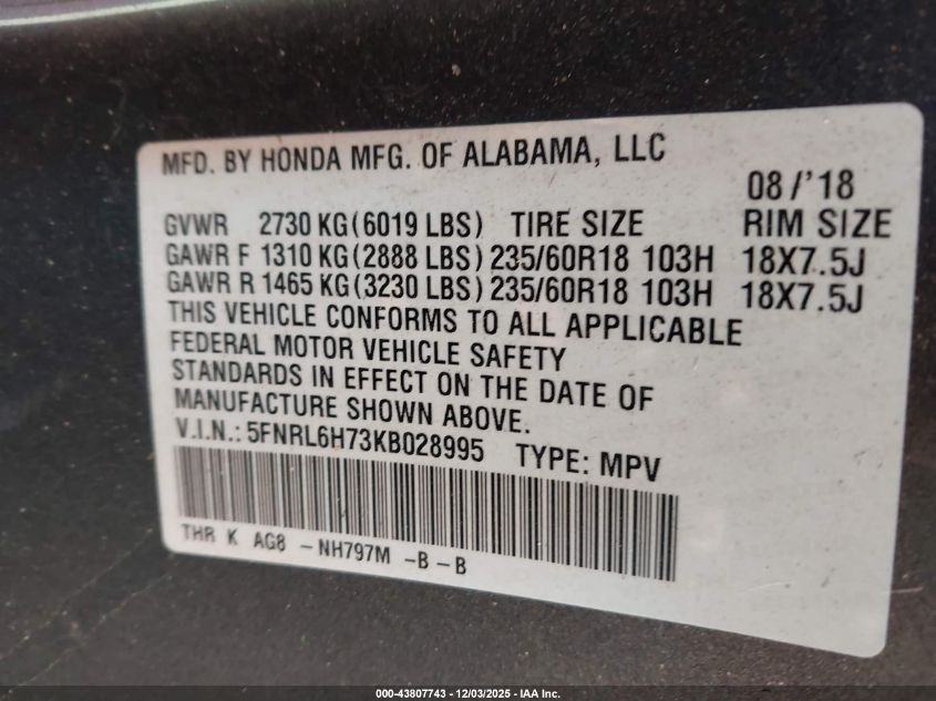 Цвет СерыйЦилиндры 6Привод Передний приводVIN 5FNRL6H73KB028995Состояние СтационарноПовреждения По бокам AutoRIA