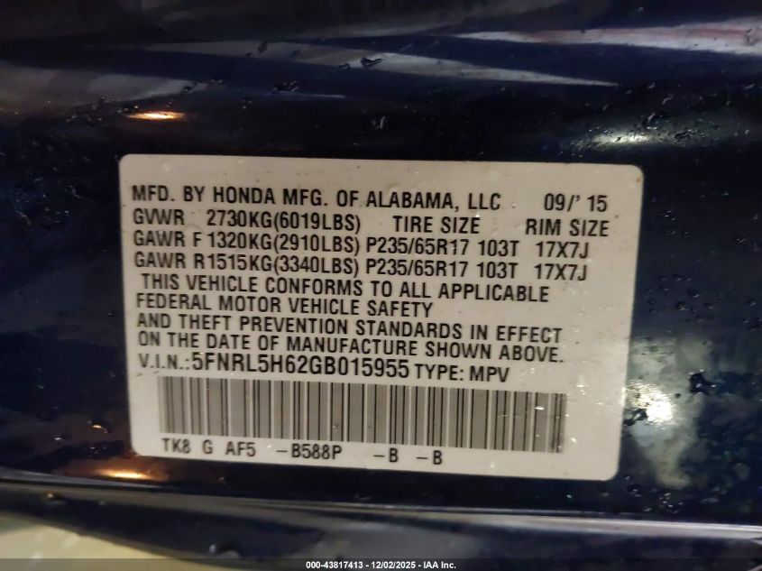 Цвет СинийЦилиндры 6Привод Передний приводVIN 5FNRL5H62GB015955Состояние Заводится и едет (проверено)Повреждения Правая сторона AutoRIA