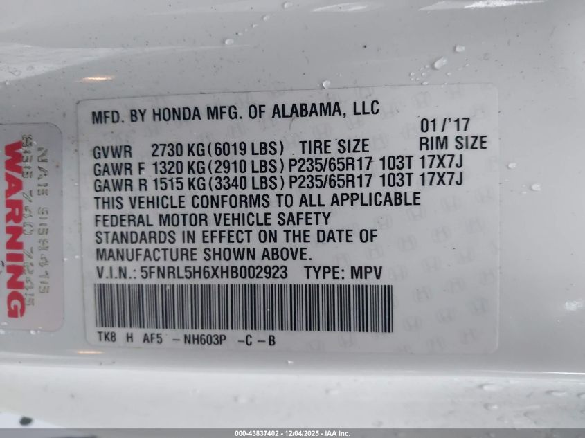 2017 HONDA ODYSSEY 2017 року Бензин, 3.5, Передний привод, vin - 5FNRL5H6XHB002923 из США