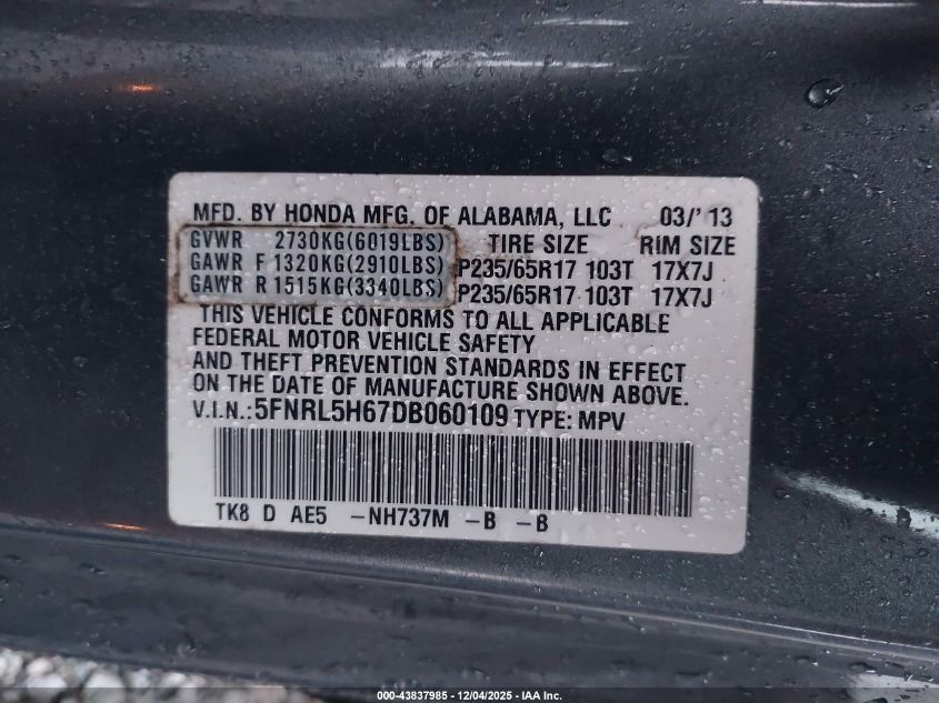Цвет СерыйЦилиндры 6Привод Передний приводVIN 5FNRL5H67DB060109Состояние Заводится и едет (проверено)Повреждения Левая сторона AutoRIA