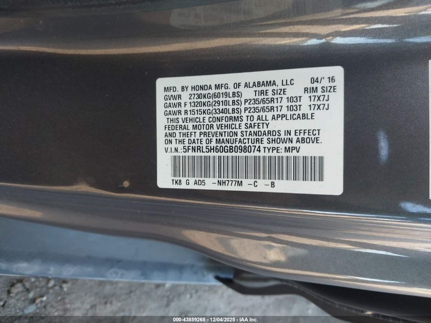 Цвет СерыйЦилиндры 6Привод Передний приводVIN 5FNRL5H60GB098074Состояние СтационарноПовреждения Обычный износ AutoRIA