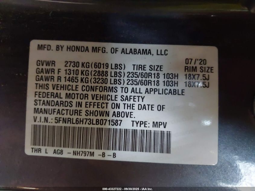 2020 HONDA ODYSSEY 2020 року Бензин, 3.5, Передний привод, vin - 5FNRL6H73LB071587 из США