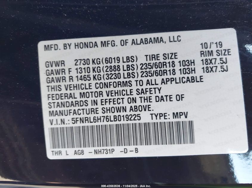 2020 HONDA ODYSSEY 2020 року Бензин, 3.5, Передний привод, vin - 5FNRL6H76LB019225 из США